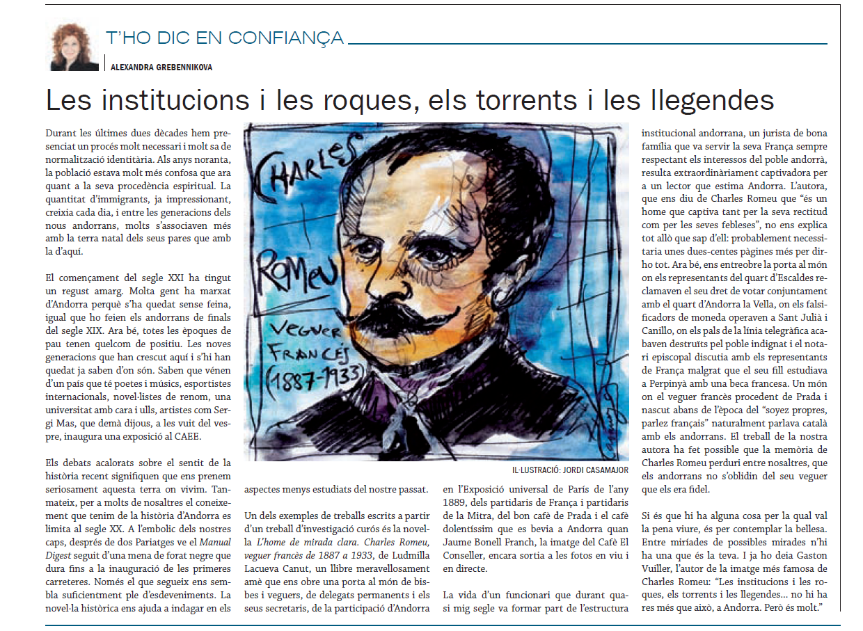 Els pioners de l’hoteleria andorrana (del segle XVI al segle XX), l’home de mirada clara (Charles Romeu, veguer francès de 1933 a 1933) i diversos contes il·lustren aquesta Andorra idíl·lica i exòtica per a certs viatgers estrangers del segle XIX i principis del segle XX. És una recerca de les nostres arrels que van desapareixent i que paga la pena de recollir-les. Un poble sense tradicions i sense arrels és un poble que ven la seva ànima. Es bo de mirar cap endavant i buscar una millor vida però com deia Antoni Fiter i Rossell al Manual Digest (any 1748) cal “Seguir los lloables Estils dels antipassats regla segura per no Errar”.