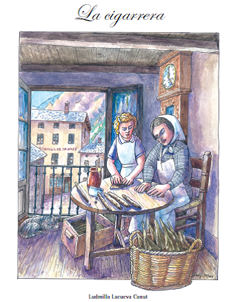 La Roseta, cigarrera de Sant Julià, que treballa a casa per compte d’una fàbrica ensenya l’ofici a la seva néta Angeleta.